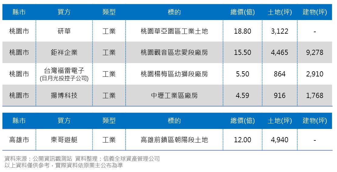 統計上市櫃法人10月工業地產交易額為56.39億元。觀察工業地產交易分布,本月交易熱區集中在桃園,最大筆紀錄為工業電腦大廠研華斥資18.8億元取得龜山區華亞段工業土地。